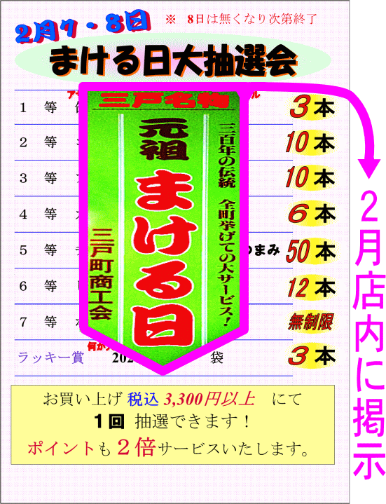 景品は2月まける日前に店内に掲示します。